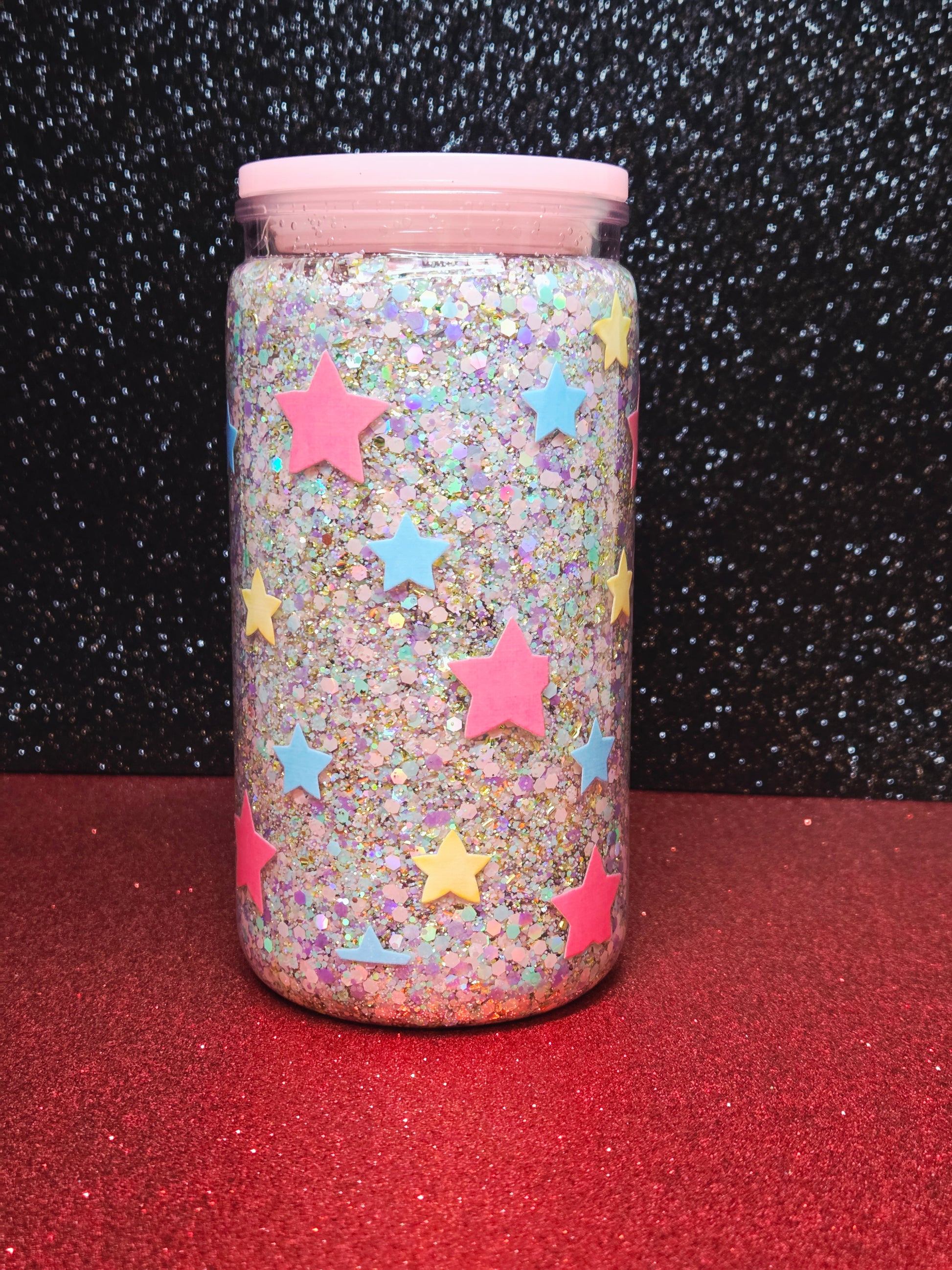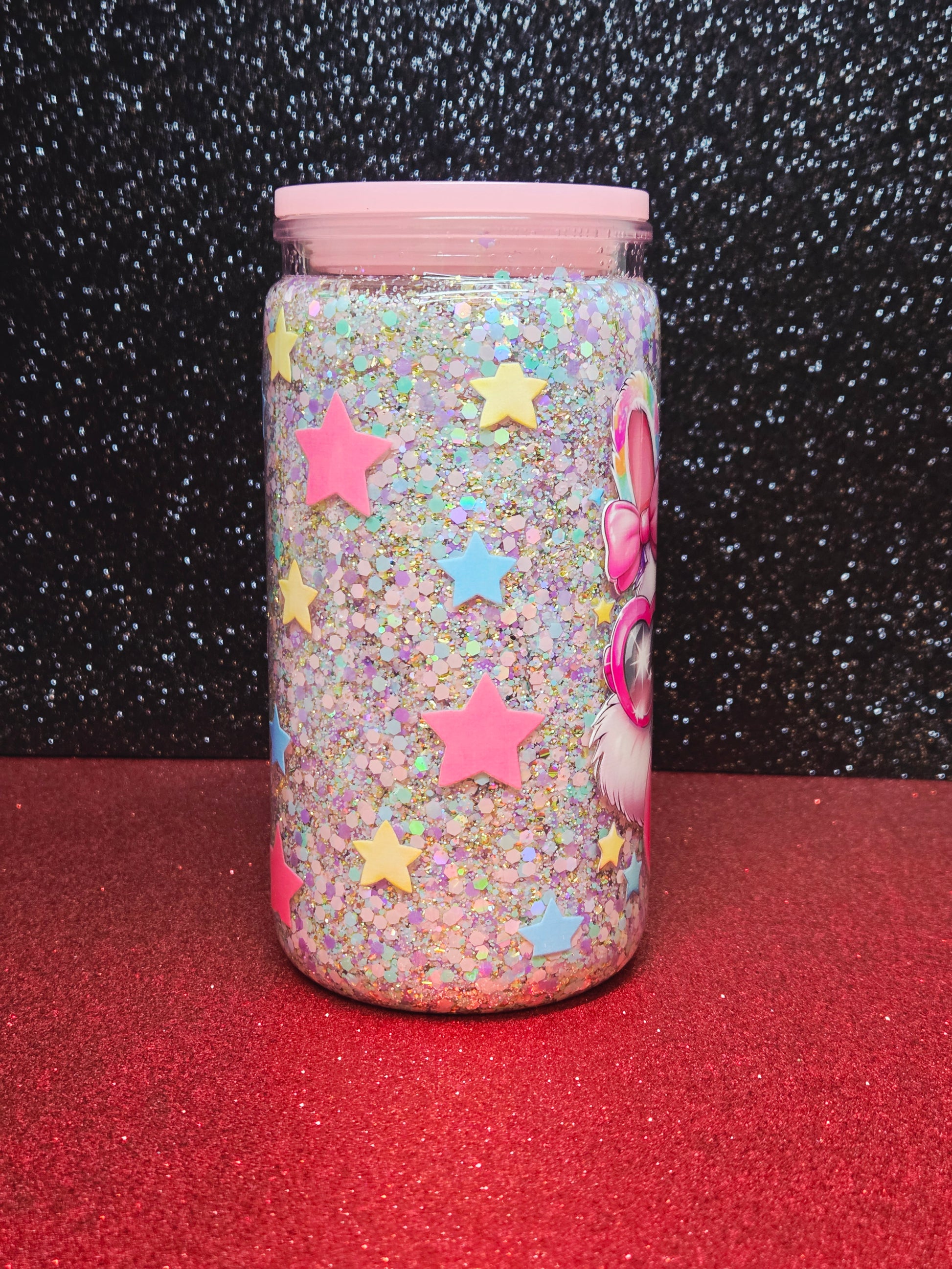 Meet the Bunny Pop – a playful 16oz glitter bomb snowglobe tumbler that brings whimsy to every sip! This adorable design features a charming bunny blowing a bubble gum bubble, suspended in mesmerizing glitter that swirls with every movement.