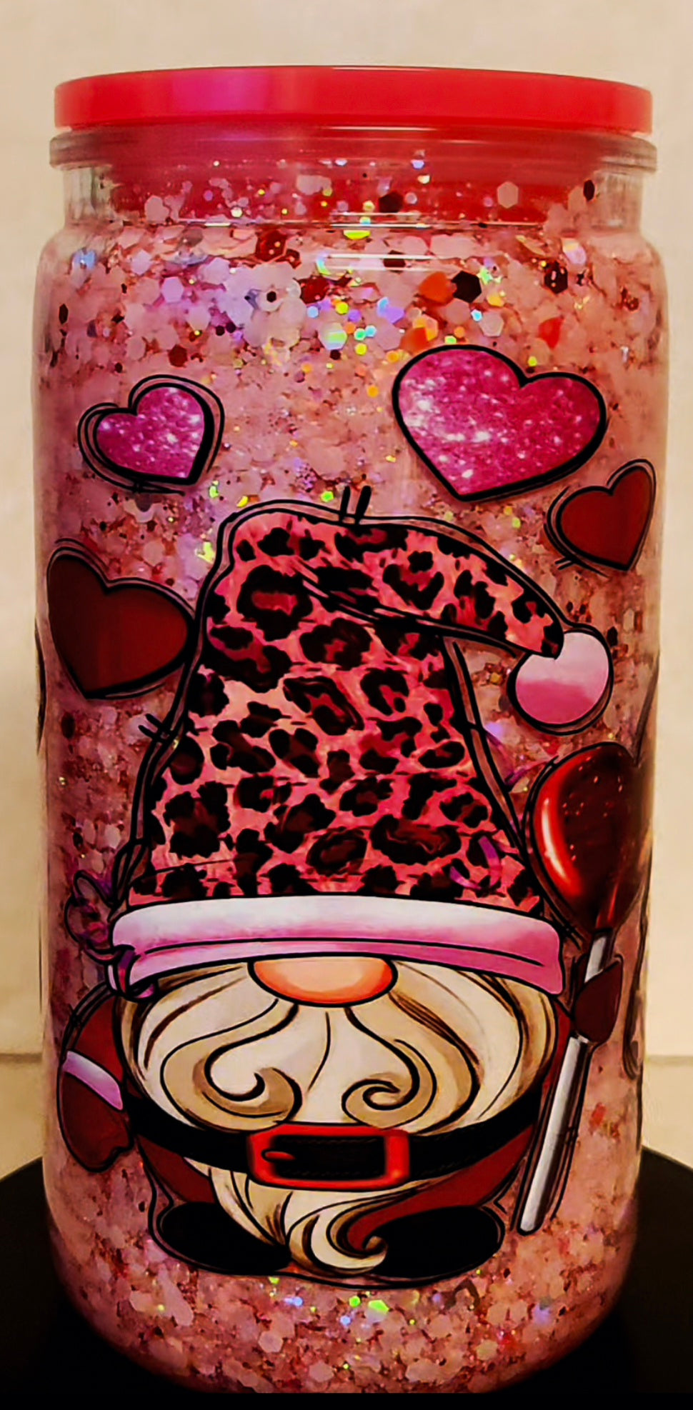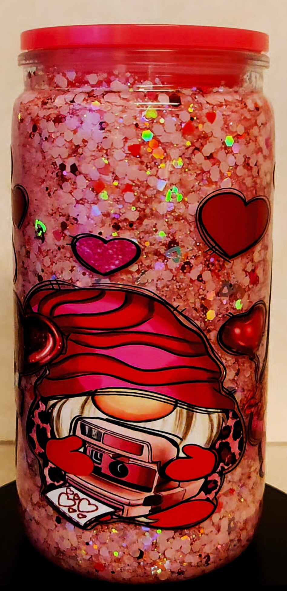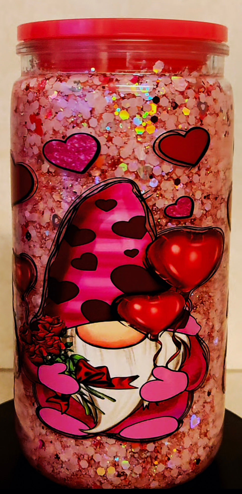 - Adorable love gnomes design with glitter bomb snowglobe effect