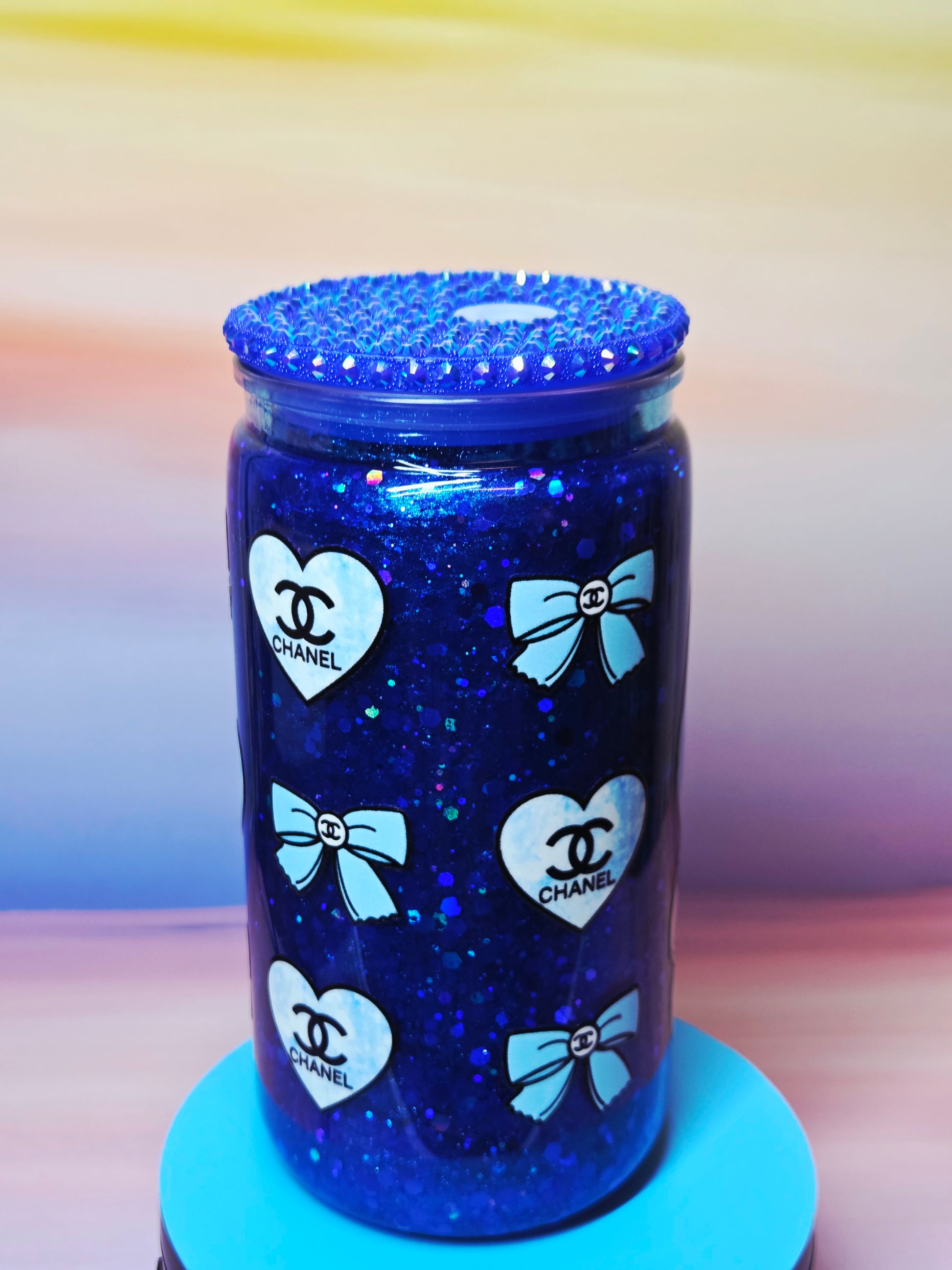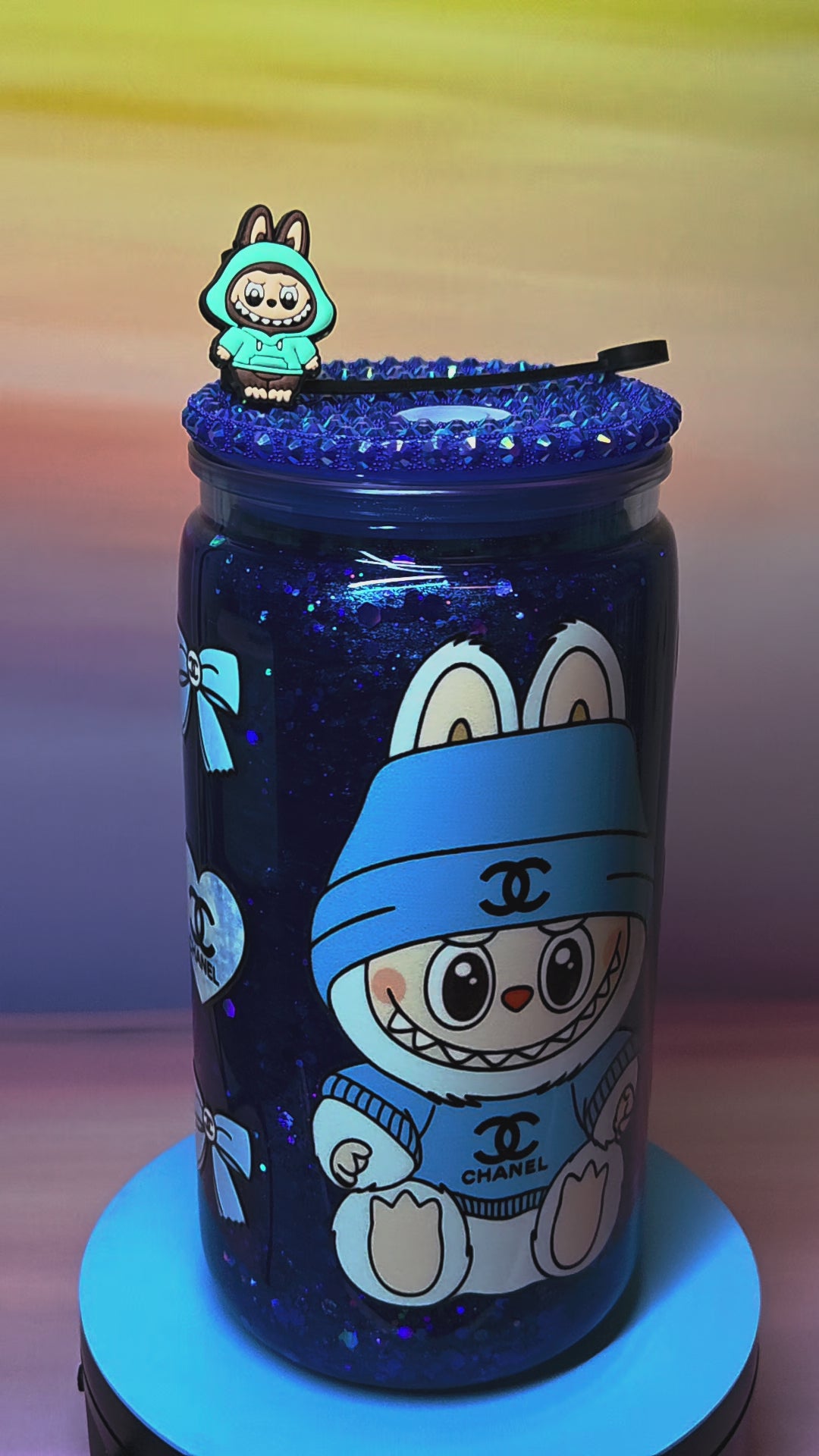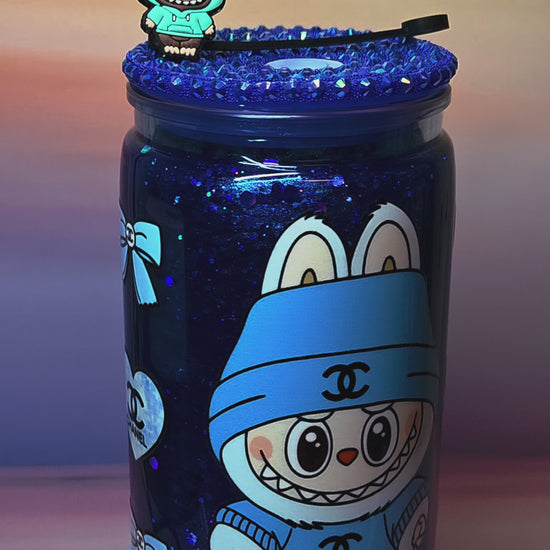 Unleash your inner fashionista with this enchanting Monster Doll Chanel blue glitter snowglobe tumbler! Featuring a stunning blue glitter effect that swirls and sparkles with high-fashion elegance, this 16oz tumbler combines the edgy charm of Monster Doll style with sophisticated Chanel-inspired glamour. Complete with a crystal bling lid and adorable Monster Doll straw topper, it's the perfect drinkware for those who know that style is everything!