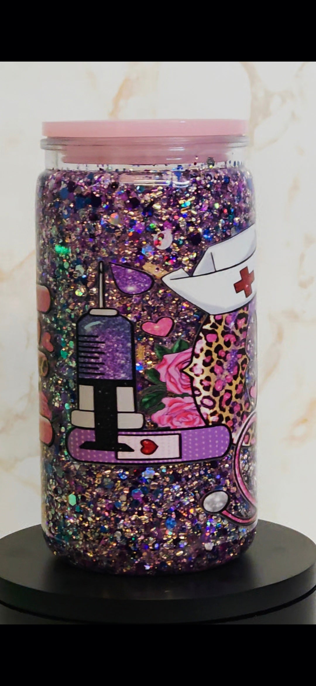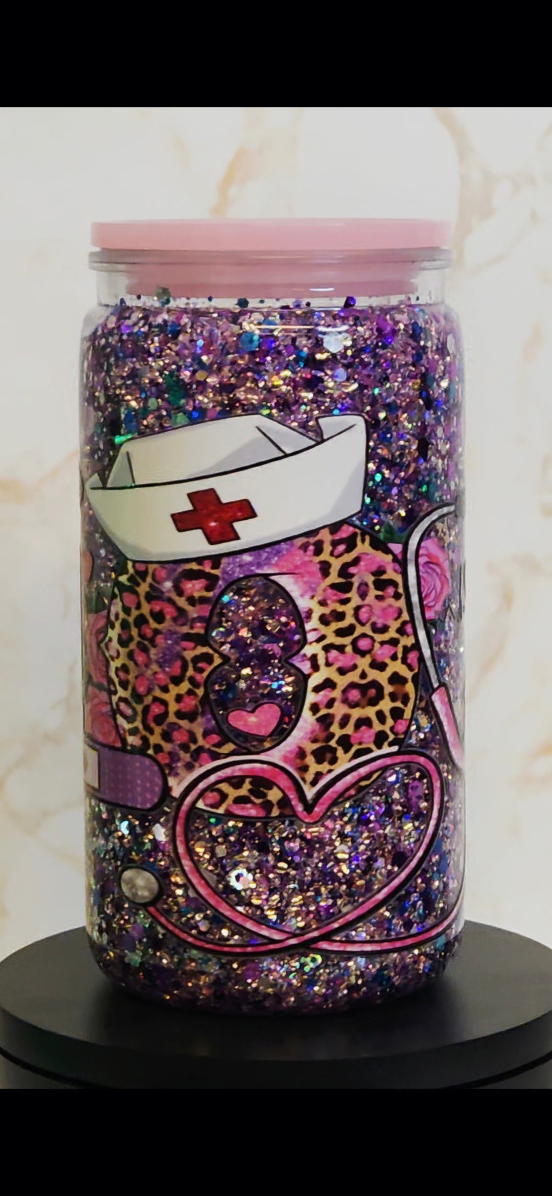 Celebrate the healthcare heroes who give their hearts to healing with this beautiful Nurse Love glitter bomb snowglobe tumbler! Featuring a dazzling explosion of glitter that sparkles with the same compassion and dedication nurses bring to their work every day, this 16oz tumbler is the perfect way to show appreciation for those who care for others. Complete with a coordinating lid, straw, and character topper, it's a meaningful gift that honors the incredible nurses who make a difference in countless lives.